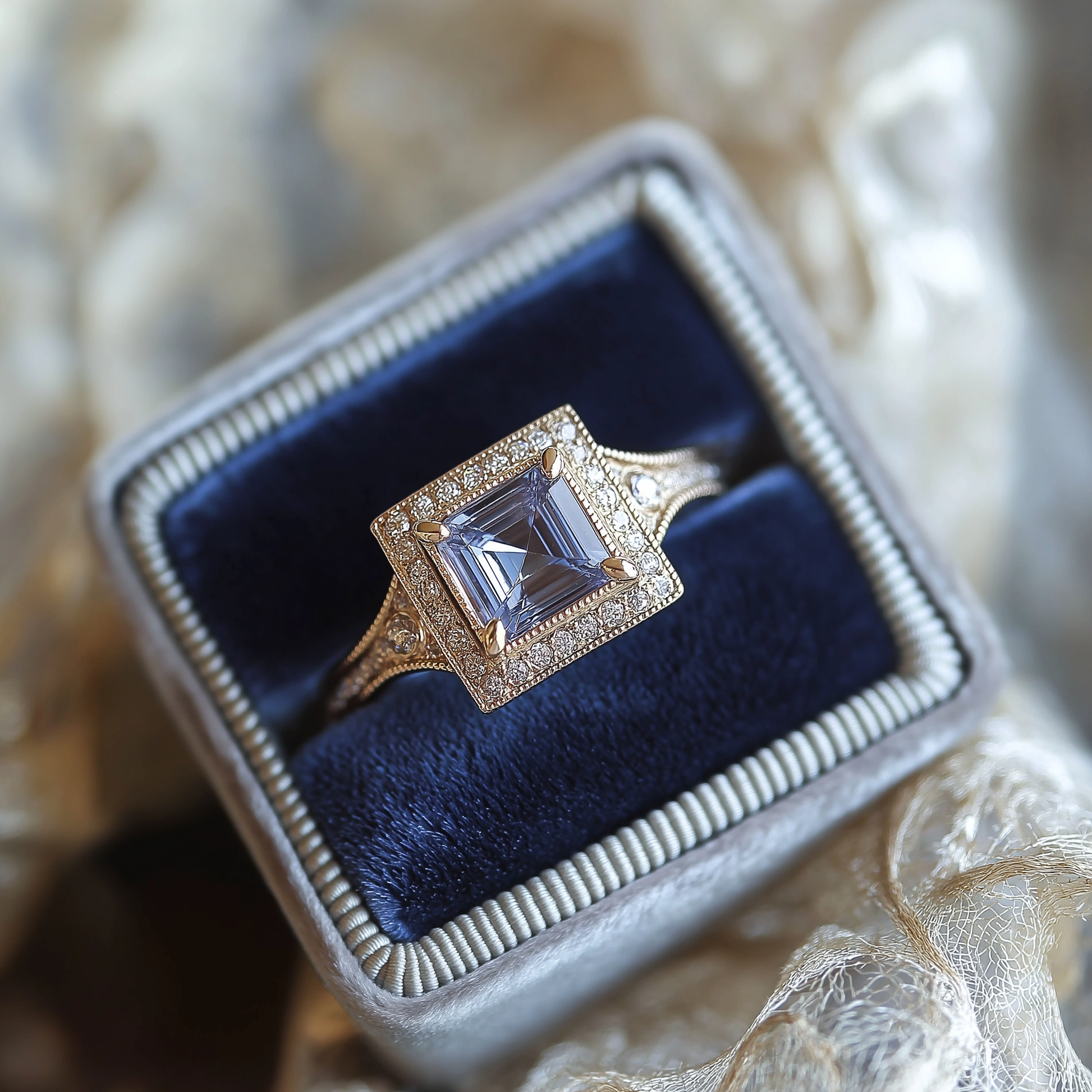 - Halo Setting: Brilliant-cut diamonds in a perfect square frame