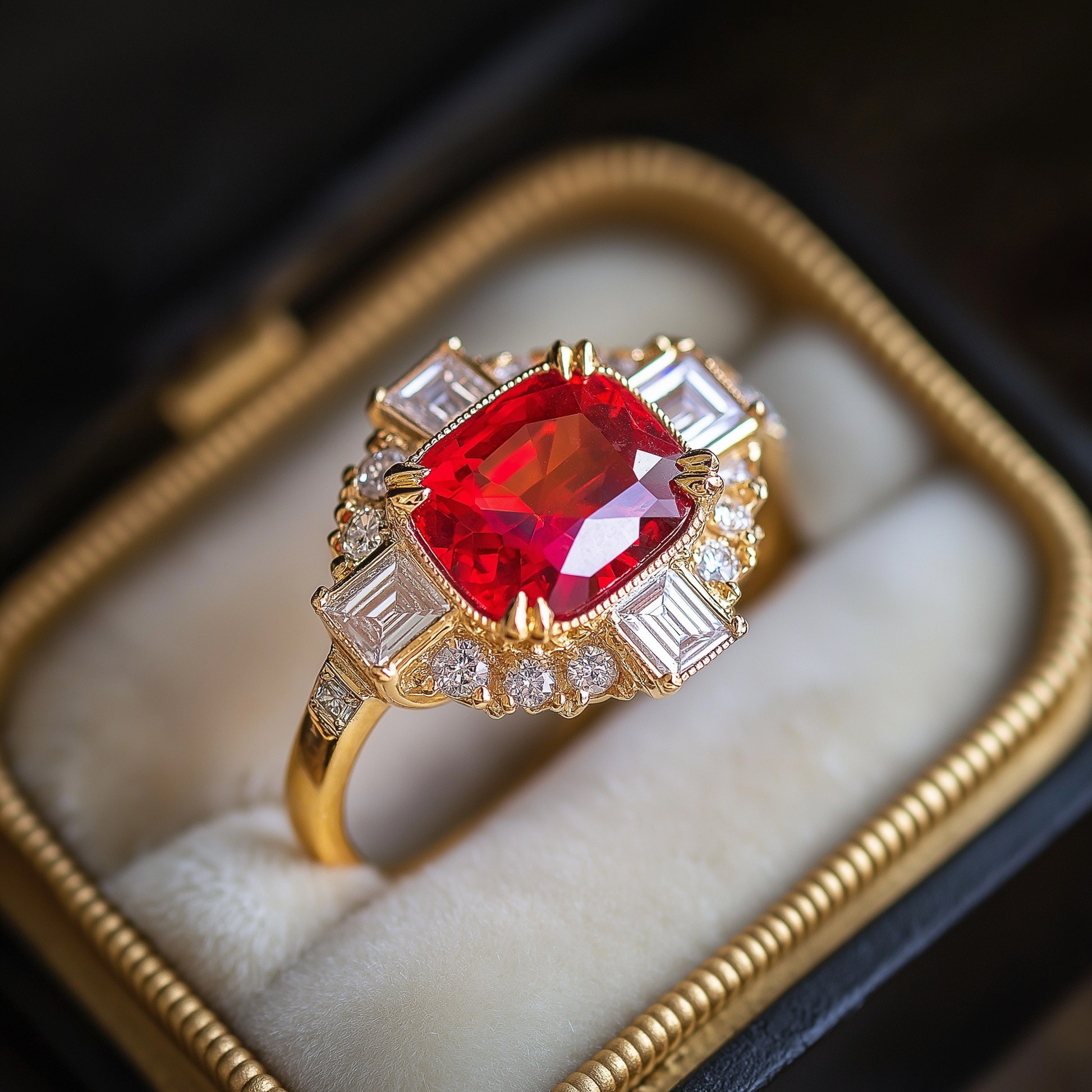 The ruby is elegantly flanked by four baguette-cut diamonds, creating a balanced and sophisticated look. The setting is further enhanced by round brilliant-cut diamonds that form a partial crown beneath the center stone, adding a regal touch to the design. The intricate milgrain detailing along the edges of the setting showcases exceptional vintage craftsmanship.
